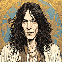 In the next realm, a series of ornate gilded platforms in astral space serve as a meeting site between the astral projections of five deities associated with the dead and afterlives - Anubis, Asase Afua, Asmodeus (in the form of Led Zepplin's Jimmy Page), Crow, and Baron Samedi - and the nine Archqueens associated with settled lands of Otherwhere (each in the form of a 1970s/1980s female music star: Cher, Diana Ross, Patti Smith, Debbie Harry, Stevie Nicks, Siouxsie Sioux, Donna Summer, and Betty Davis, plus one disco-esque chrome figure). A mortal woman named Haldo serves as moderator, and three more Guild members stand as witnesses: Exemplar of Allwheres (in the guise of Prince), Beacon of Allwheres (looking like Bruce Springsteen), and Weaver (as a rather disinterested Jimi Jendrix).